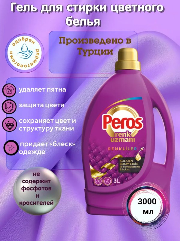 Представляем вам универсальный жидкий гель для стирки белья Peros matic. Peros Color Expert (эксперт) Liquid Care Detergent Colors, который может стать отличным помощником в уборке вашего дома. Это средство прекрасно подходит для стирки одежды детей и новорожденных благодаря своей гипоаллергенной формуле, что гарантирует безопасность и бережный уход за нежной кожей. Парфюмированный аромат цветов наполняет вещи свежестью, а также помогает сохранить яркость цветного белья. Густая жидкость легко растворяется в воде, обеспечивая высокую эффективность даже при ручной стирке. Концентрат в упаковке объемом 3 литров позволит вам не беспокоиться о частых покупках. Ваша одежда будет защищена от пятен и грязи благодаря уникальной формуле очистки, которая минимизирует использование химии. Этот продукт удобно использовать в стиральной машине автомат, так как он подходит для различных режимов стирки. Вы можете подарить этот гель своим близким или друзьям в качестве полезного подарка.