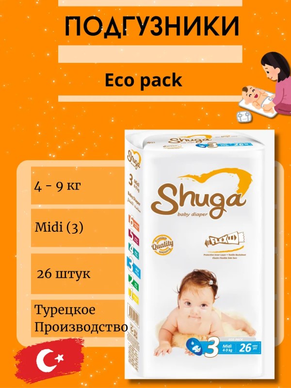 Подгузники Shuga Nappy для новорожденных созданы для защиты чувствительной кожи. Гипоаллергенные материалы без вредных добавок минимизируют риск аллергии. Многослойная система впитывания обеспечивает сухость: внутренний слой отводит влагу, абсорбирующий слой надежно удерживает жидкость, сохраняя поверхность сухой для профилактики опрелостей. Эргономичный крой с учетом анатомии новорожденного обеспечивает идеальное прилегание. Эластичные манжеты и поясок создают барьер от протеканий во время сна и бодрствования. Широкий размерный ряд (включая размер 1, 0-5 кг, newborn) позволяет точно подобрать подгузники по весу ребенка. Формат подгузников обеспечивает легкую и быструю смену. Мягкие дышащие материалы предотвращают натирание. Подходят для мальчиков и девочек. Оптимальны для использования днем и ночью. Упрощают уход за новорожденным.